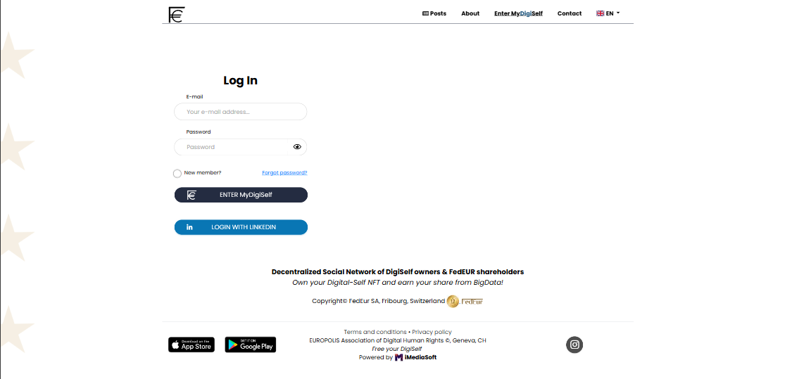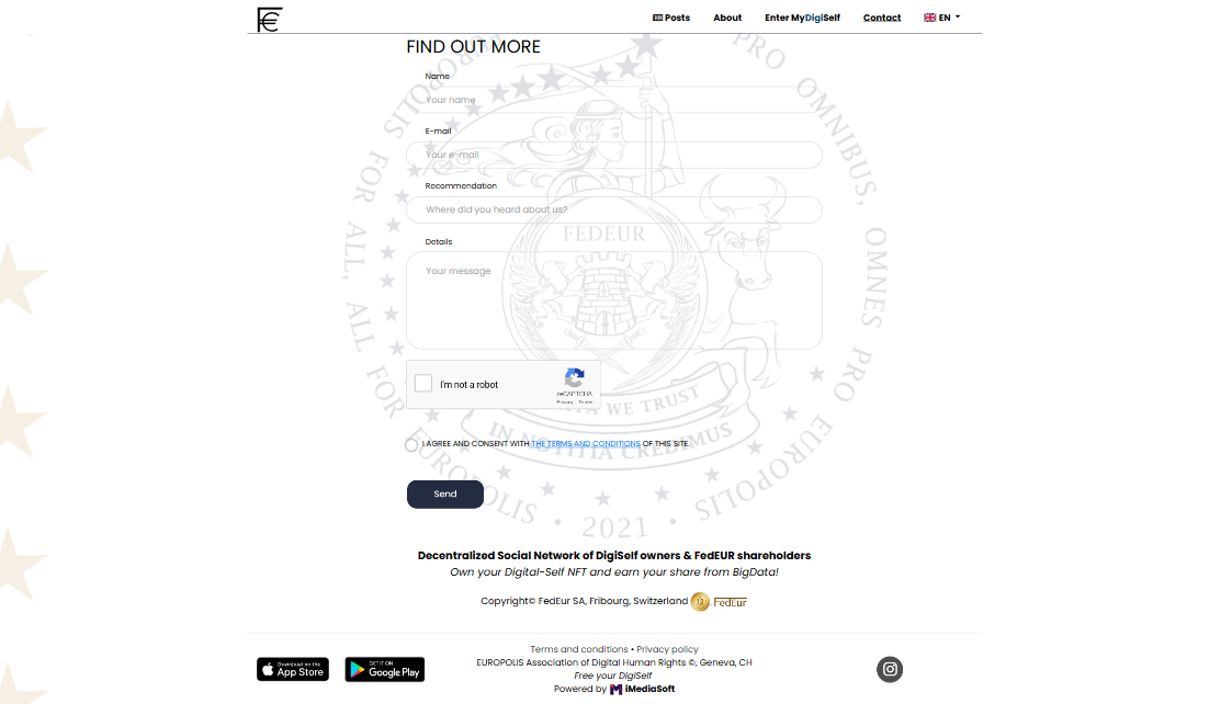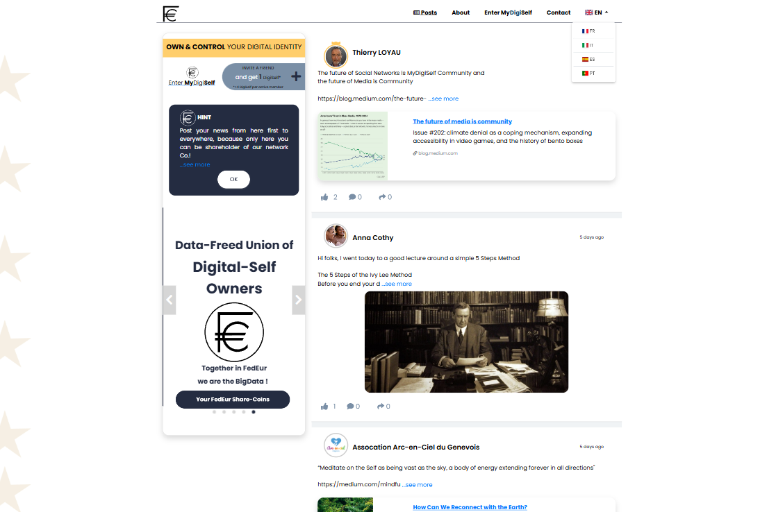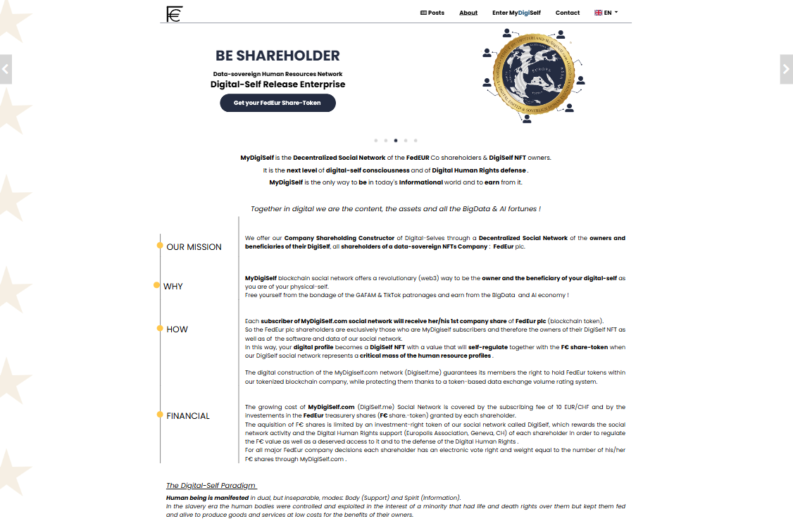 MyDigiSelf is an innovative web platform operating as a decentralized social network dedicated to FedEUR Co shareholders and DigiSelf NFT holders. The project promotes the concept of autonomous digital identity, providing users with full control over their personal data and real opportunities to monetize their online presence.