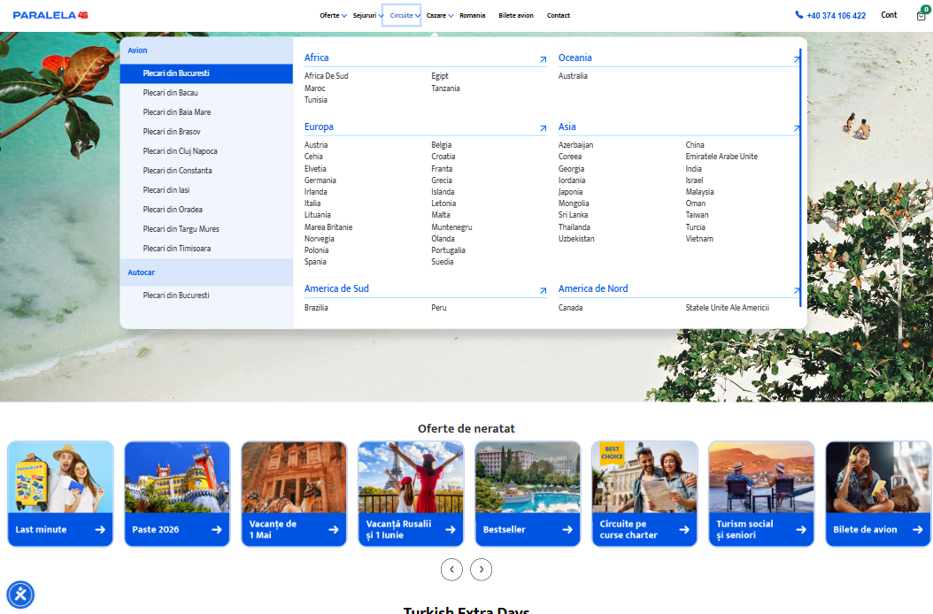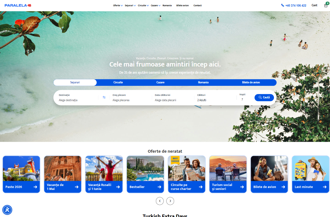 Interfața a fost optimizată pentru o navigare fluidă, iar funcționalitățile avansate permit personalizarea experienței utilizatorilor, filtrarea rapidă a pachetelor și afișarea dinamică a ofertelor speciale, early booking și last minute.
