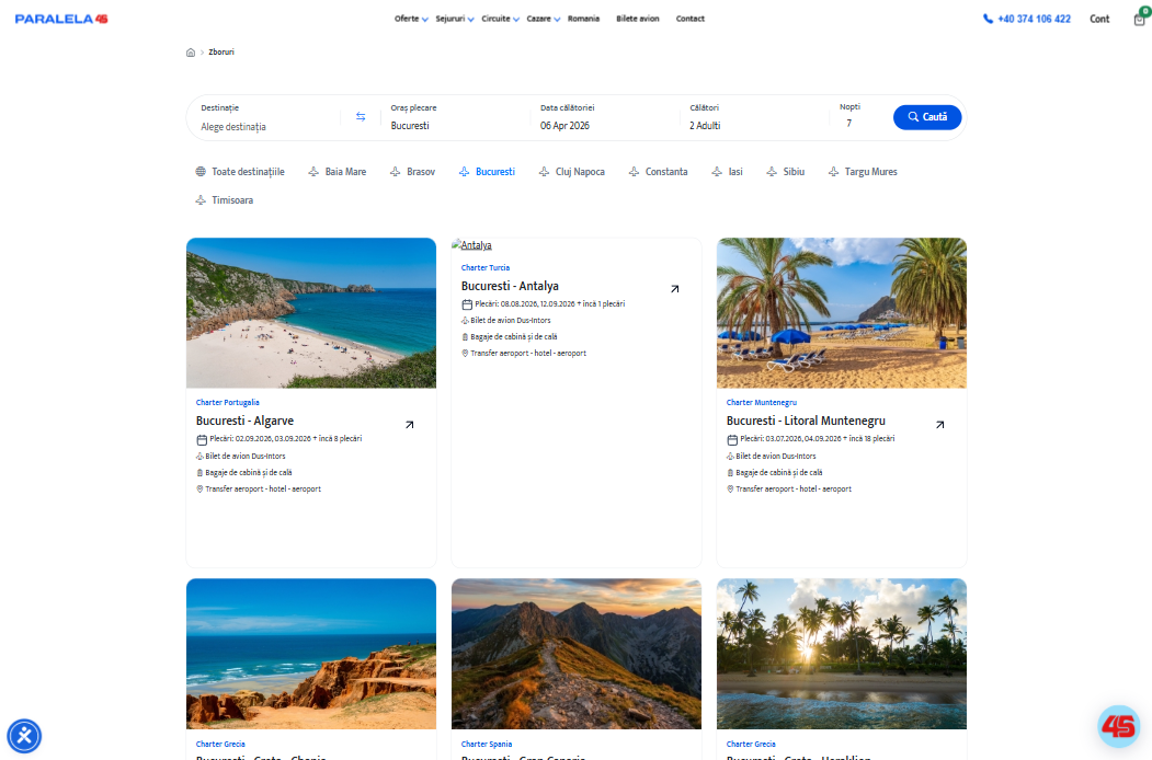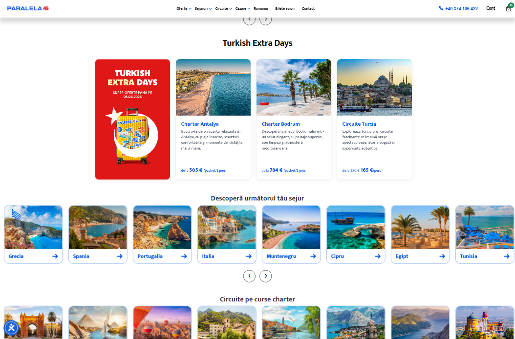 Platforma Paralela 45 oferă o experiență digitală completă și modernă, facilitând procesul de rezervare și creșterea conversiilor. Automatiarea fluxurilor interne și accesul rapid la informații contribuie la eficiența operațională, consolidând poziția agenției în industria turismului și sporind satisfacția clienților.