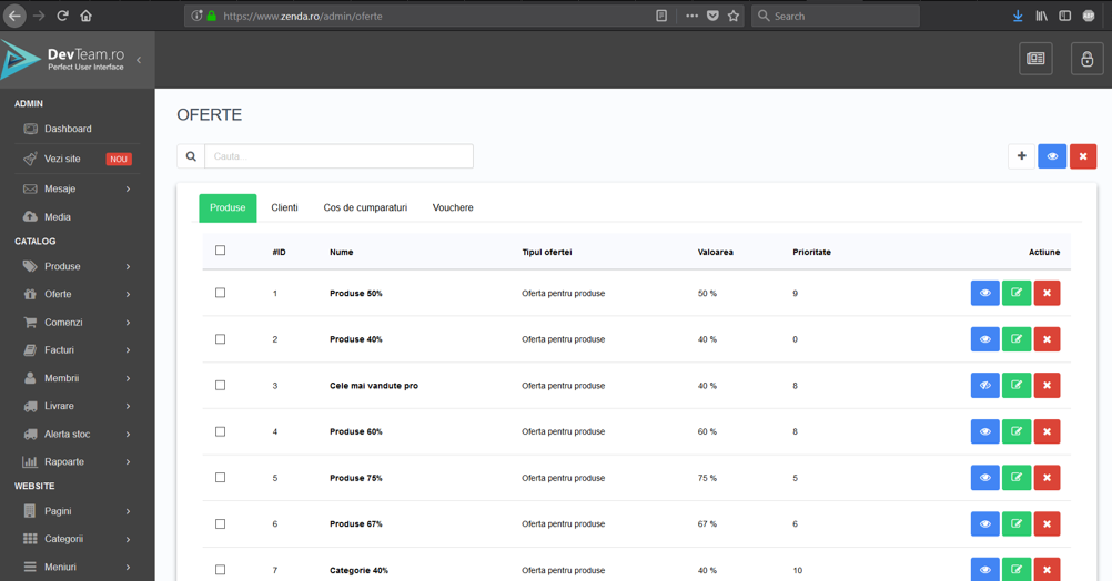 Modul oferte și vouchere: configurare promoții procentuale sau valorice, discounturi pe categorii, produse, coșuri de cumpărături sau vouchere cu valabilitate limitată.